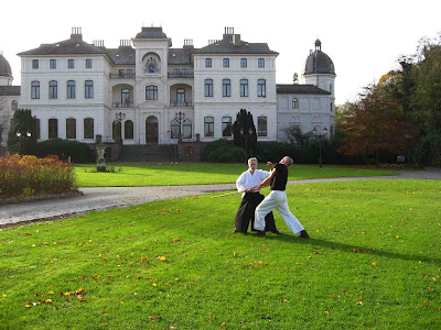 I’ve just finished teaching the fourth day of a week-long seminar in a retreat center outside the German city of Kiel.The seminar is taking place in an 18th century castle. The first photo below is the front of the castle, and the second photo is the back yard.The seminar is being led by a German theater director. It is a production of some scenes from Hamlet, and the focus of the theater work is a study of the nature of revenge. The participants are Egyptian and Palestinian actors. Next week a group of Israelis will go through the same program.My role in the seminar is to teach body awareness and centering to the actors, and my contribution comes out of the combination of Aikido and Being In Movement® body awareness training. I am helping the actors gain a clear experience of how feelings of revenge weaken the muscles and posture — and how kindness strengthens the muscles and improves balance.